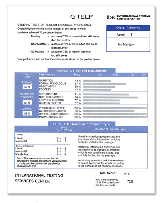 The G-TELP Level Test provides an informative score report profile. In addition to the scores, the report provides descriptions explaining the grammar structures, listening and reading tasks, and question types reflected on the test. Level Mastery Score is determined by the number of skill areas in which the examinee has accumulated a Skill Area Score of 75% or more. Demonstrating Mastery at Level Two is a prerequisite for taking the Level One test.