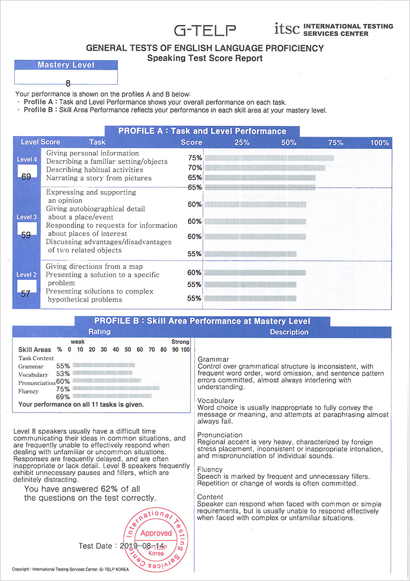 The results will be released no later than eight working days after the test date on the G-TELP website. The original score report will be printed out or mailed out directly to test-takers within two weeks of the test date.