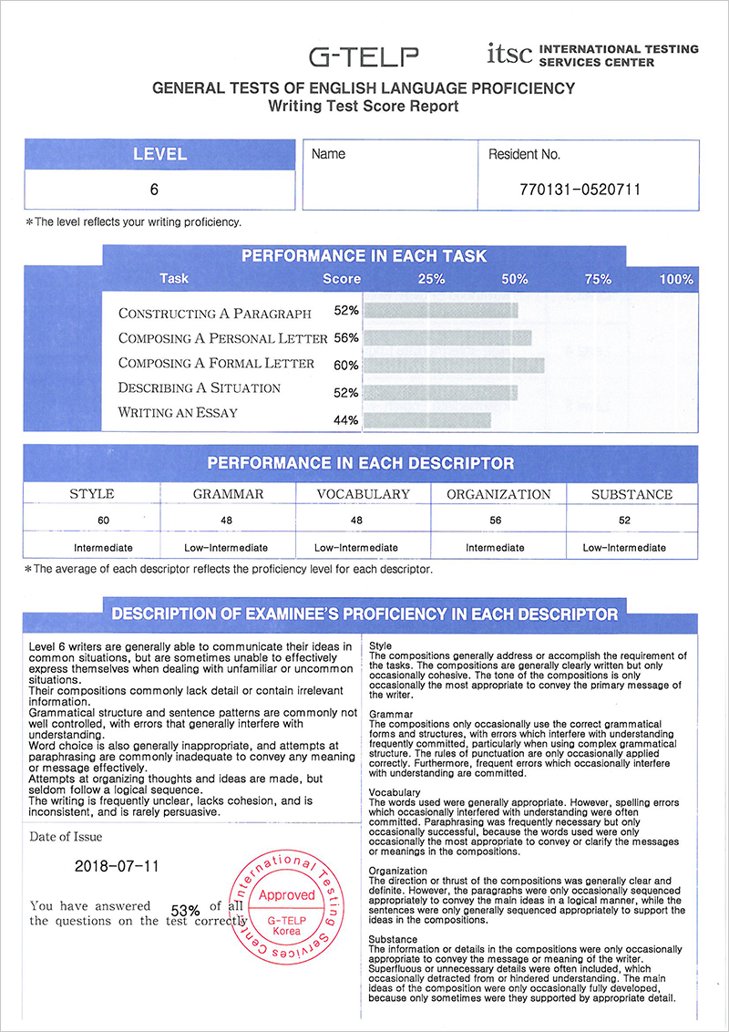 The results will be released no later than eight working days after the test date on the G-TELP website. The original score report will be printed out or mailed out directly to test-takers within two weeks of the test date.